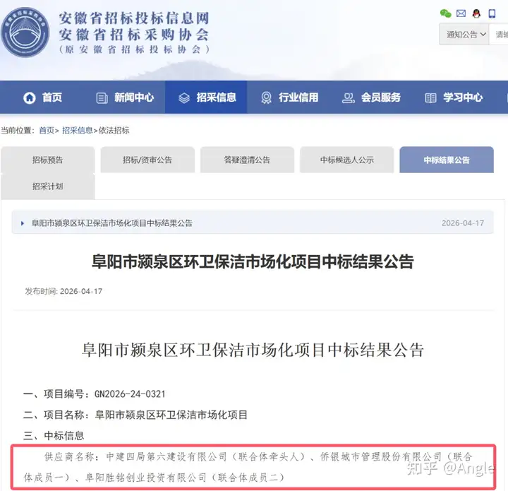 近日,阜阳市颍泉区环卫保洁市场化项目发布中标结果公告,中建四局第六建设有限公司(联合体牵头人)、侨银城市管理股份有限公司(联合体成员一)、阜阳胜铭创业投资有限公司(联合体成员二)组成的联合体中标该项目,中标金额6603万元/年。